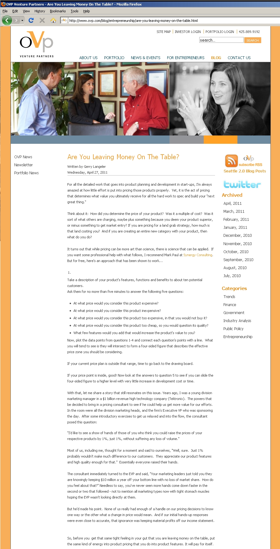 Venture Capitalist recommends hiring Synergy. April, 2011